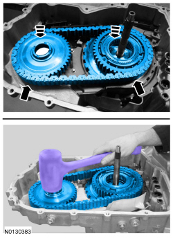 275. Simultaneously install the drive/driven sprocket and chain assembly. Lightly tap on the driven sprocket to be sure it is fully seated in the case.