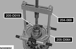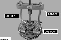 2. Using 205-D019 (D80L-630-8) , 205-D064 (D84L-1123-A) and 204-069 (T81P-1104-C) , remove the right differential carrier bearing from the differential assembly.