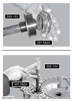 Assemble 205-153 (T80T-4000-W) on 307-582A and install a new RH (Right Hand) halfshaft seal on 307-582A. Using 205-153 (T80T-4000-W) and 307-582A install the RH (Right Hand) halfshaft seal in the torque converter housing.