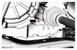 4. With the engine running in PARK on a level hoist use the scan tool to make sure that the transmission is at normal operating temperature 85° C (185° F) - 93° C (200° F). Remove the oil leveling plug and check if the Motorcraft(R) MERCON(R) LV Automatic Transmission Fluid is even with the oil leveling plug hole.