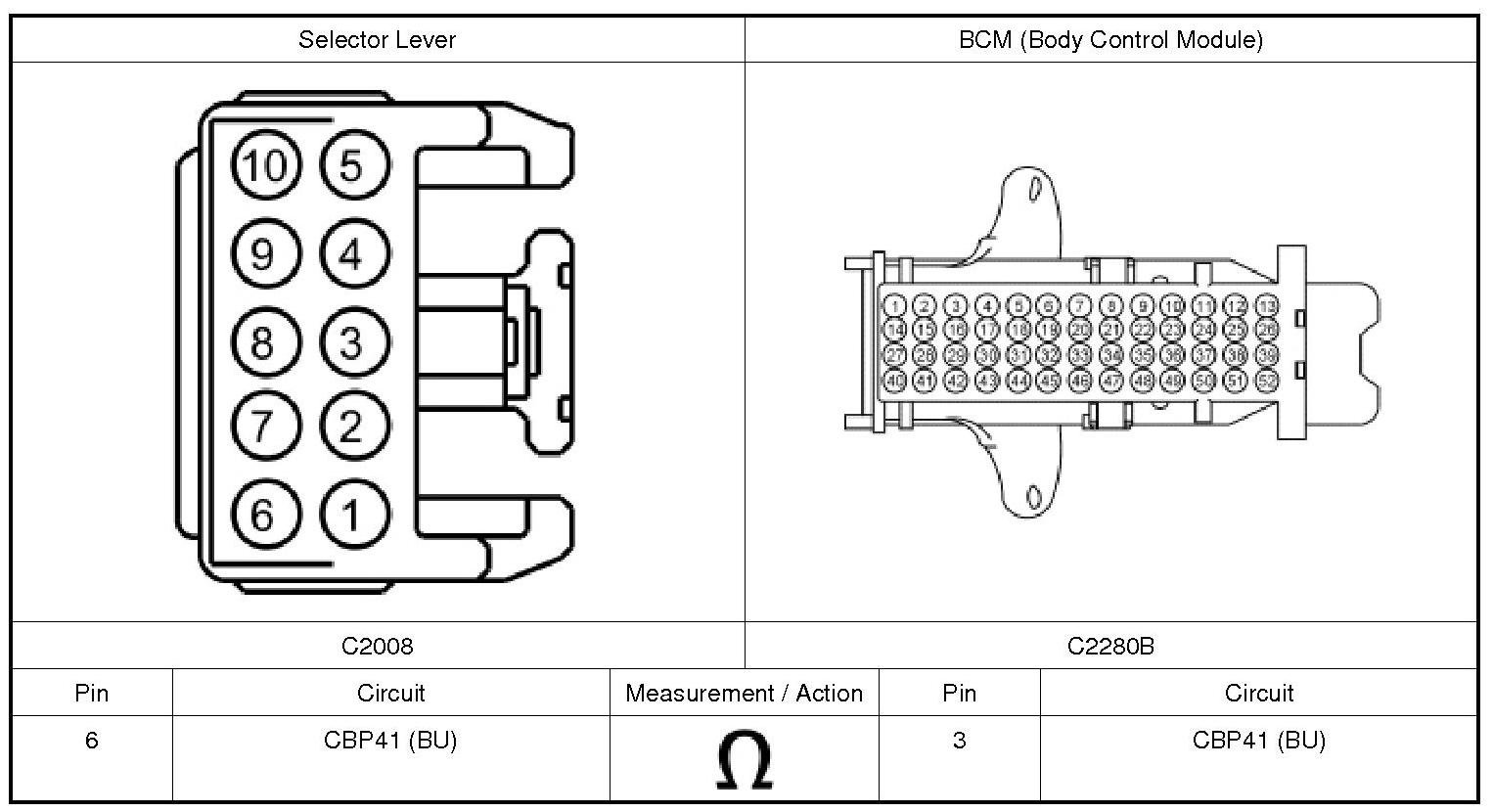 3. Measure the resistance of circuit CBP41 (BU) from selector lever C2008-6 to the BCM (Body Control Module) C2280B-3.
