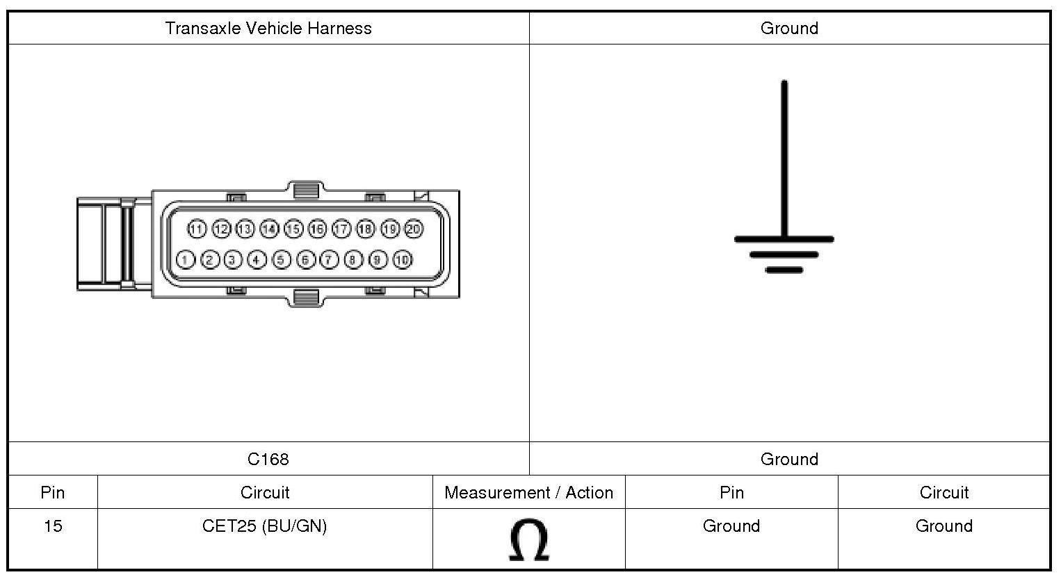 1. Measure the resistance of circuit CET25 (BU/GN) from the transaxle vehicle harness C168-15 to ground.