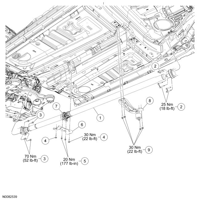 2. With the help of an assistant, install the driveshaft and the 2 outer center bearing bracket bolts.
