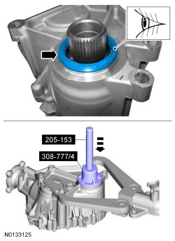 2. Position the inner seal above the PTU (Power Transfer Unit) input shaft opening with the spring facing toward the PTU (Power Transfer Unit). Using 308-777 /4 and 205-153 (T80T-4000-W) , install the seal.