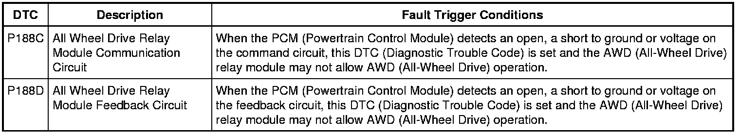 The active, on-demand AWD (All-Wheel Drive) system uses data from other systems as inputs to the PCM (Powertrain Control Module). The PCM (Powertrain Control Module) uses the inputs to determine the appropriate duty cycle to send to the AWD (All-Wheel Drive) relay module over hardwired command/control circuit and returns information over the feedback/monitor circuit.
