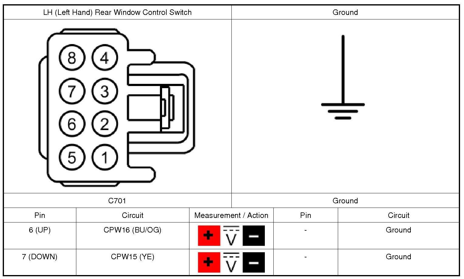 2. Disconnect: Suspect RH (Right Hand) Front Window Control Switch C604, Rear Window Control Switch C701 (LH (Left Hand)) or C801 (RH (Right Hand)).