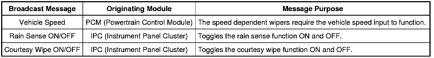 The wiper system is activated by the wiper/washer switch. The SCCM (Steering Column Control Module) commands the windshield wiper motor to activate the appropriate wash, low, high and intermittent modes through a private LIN (Local Interconnect Network).