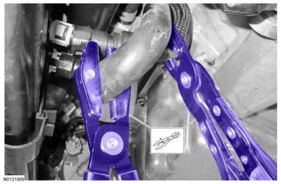 4. Using hose clamp pliers, clamp off the 2 oil cooler coolant hoses.