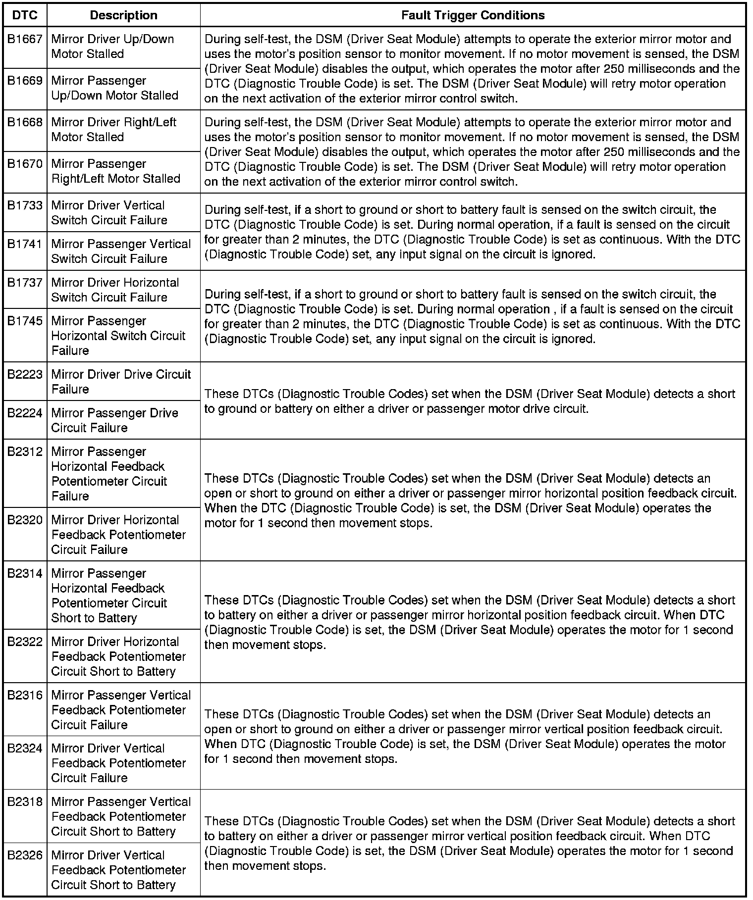 5. If only DTC (Diagnostic Trouble Code) B1669 is set, while toggling the DSM (Driver Seat Module) PID (Parameter Identification) Passenger's Mirror Up (PR_UP) to On, measure: