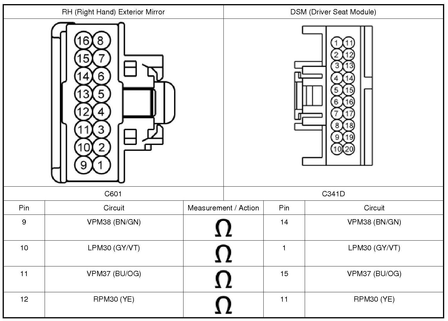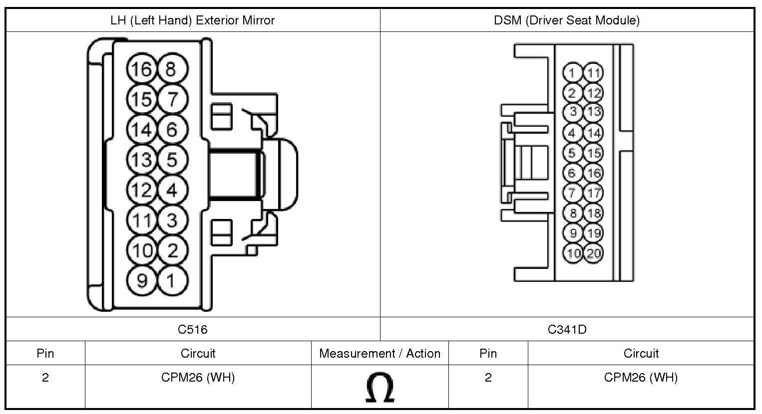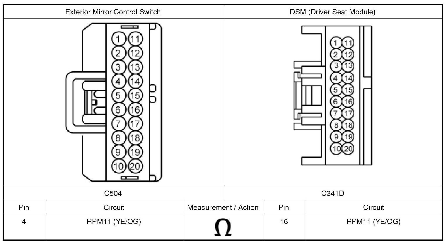 7. If both DTCs (Diagnostic Trouble Codes) B1669 and B1670 are set, while toggling the DSM (Driver Seat Module) PID (Parameter Identification) Passenger's Mirror Left (PR_LEFT) to On, measure: