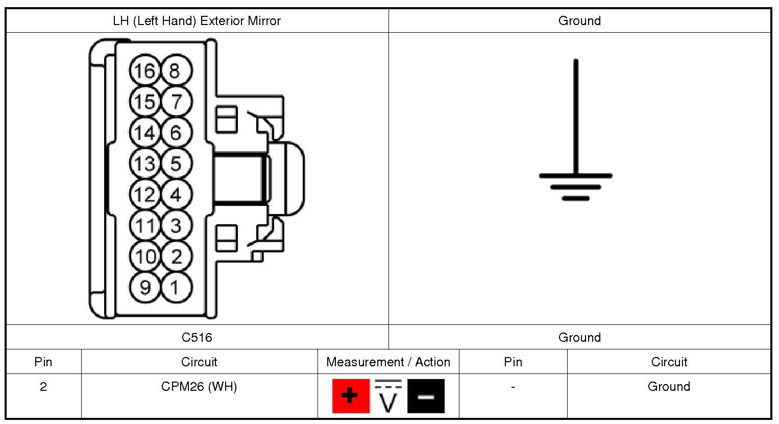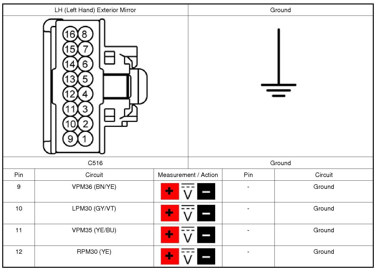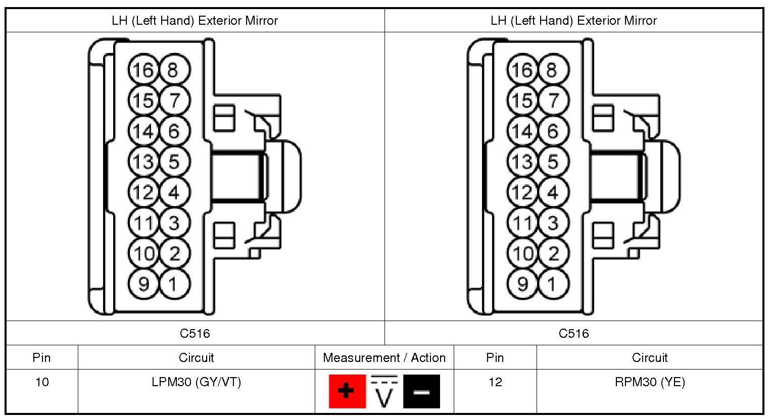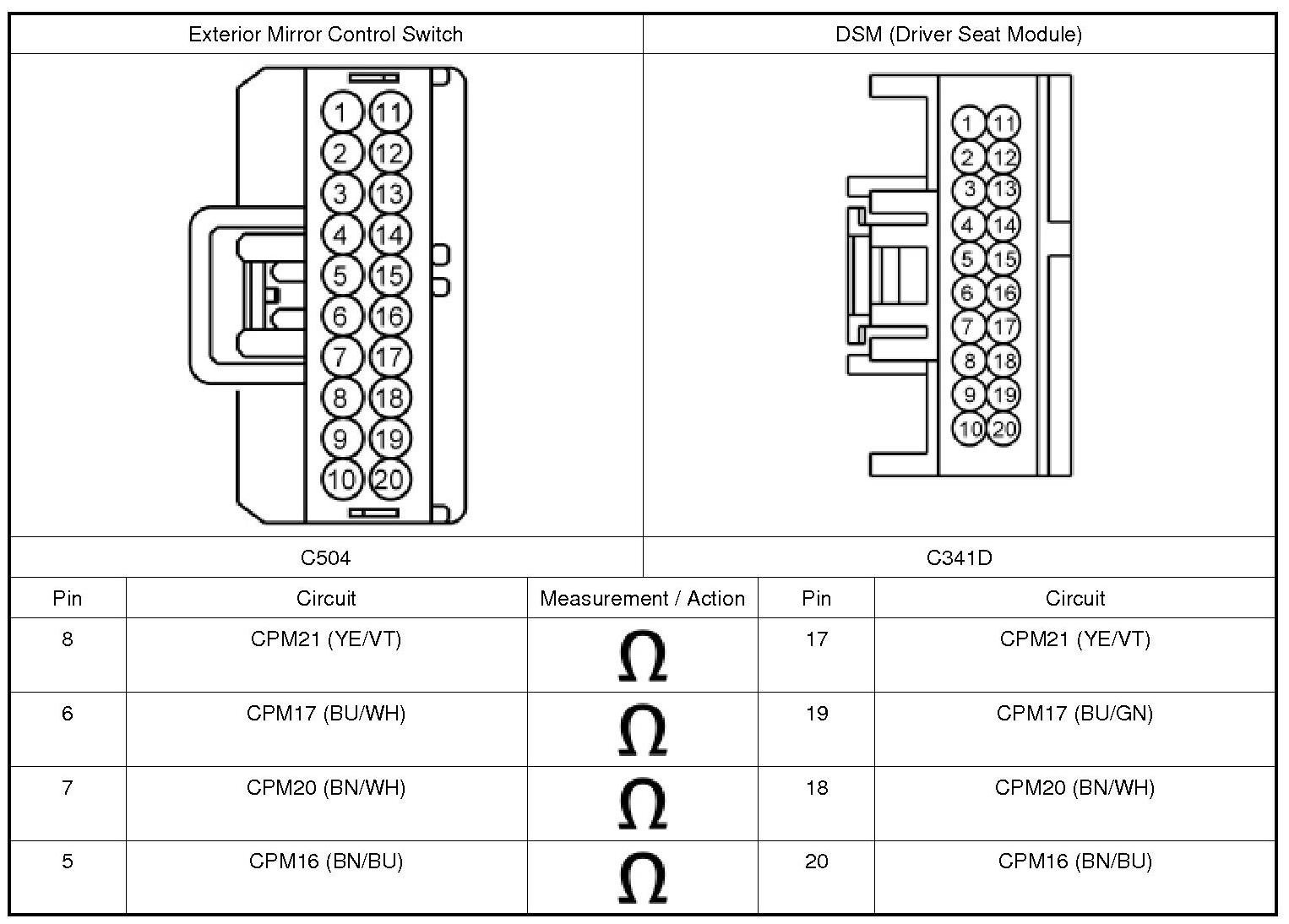 7. If both DTCs (Diagnostic Trouble Codes) B1669 and B1670 are set, while toggling the DSM (Driver Seat Module) PID (Parameter Identification) Passenger's Mirror Left (PR_LEFT) to On, measure: