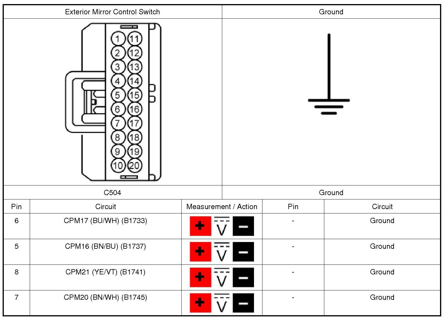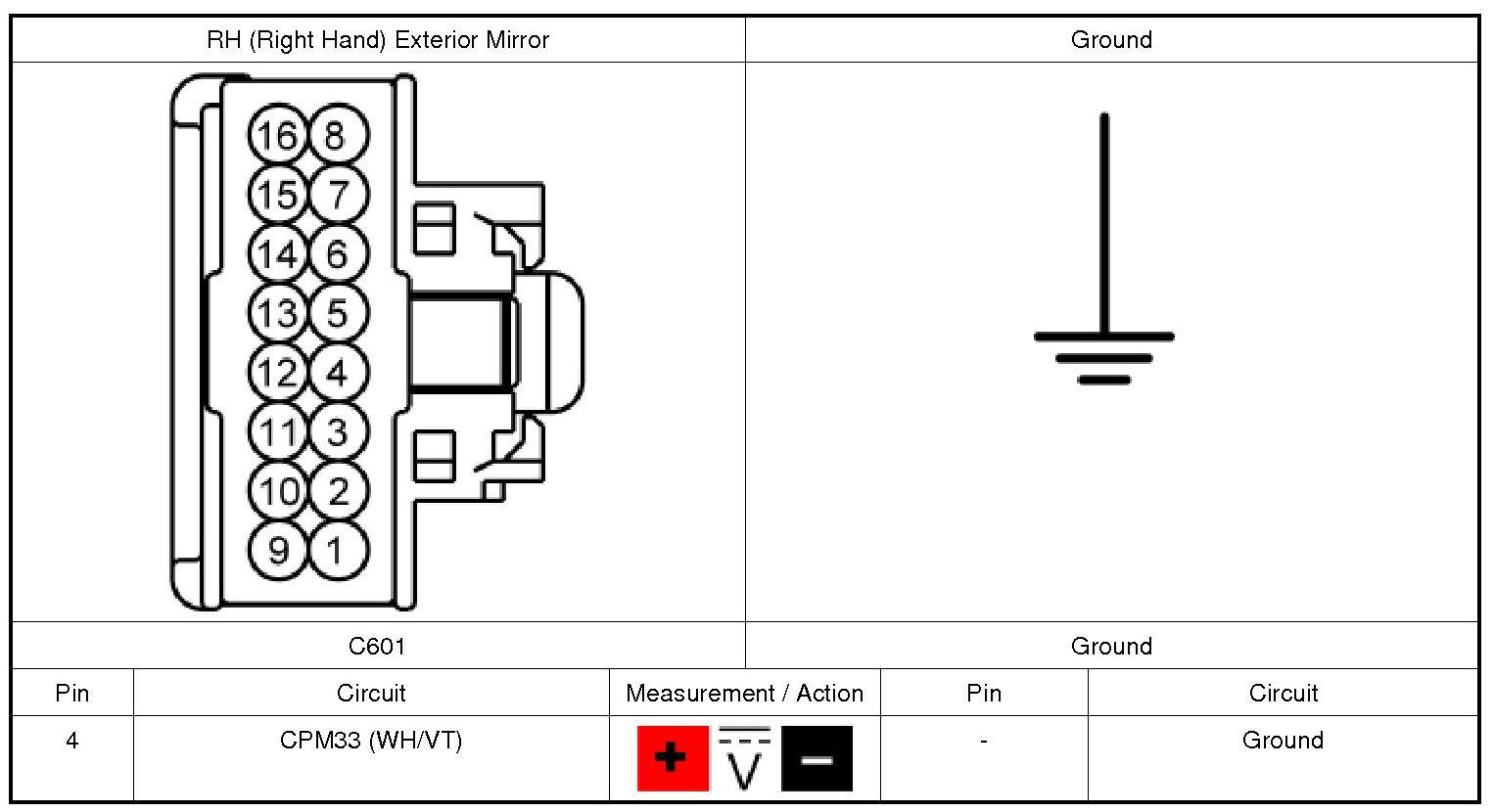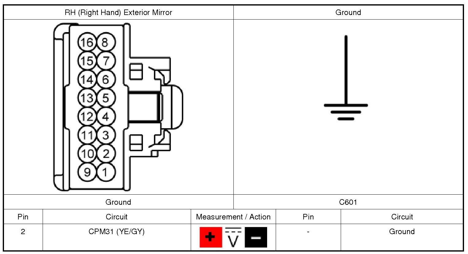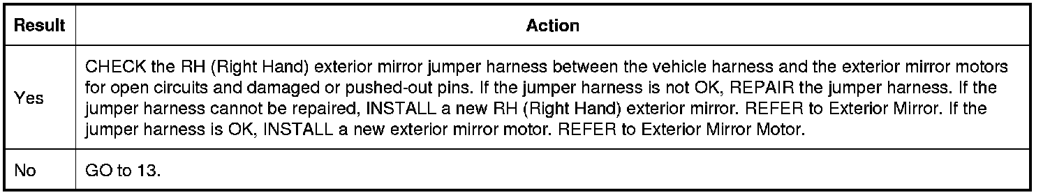 12. CHECK THE RH (Right Hand) EXTERIOR MIRROR FOR VOLTAGE WHILE COMMANDING THE DSM (Driver Seat Module) PIDs (Parameter Identifications)