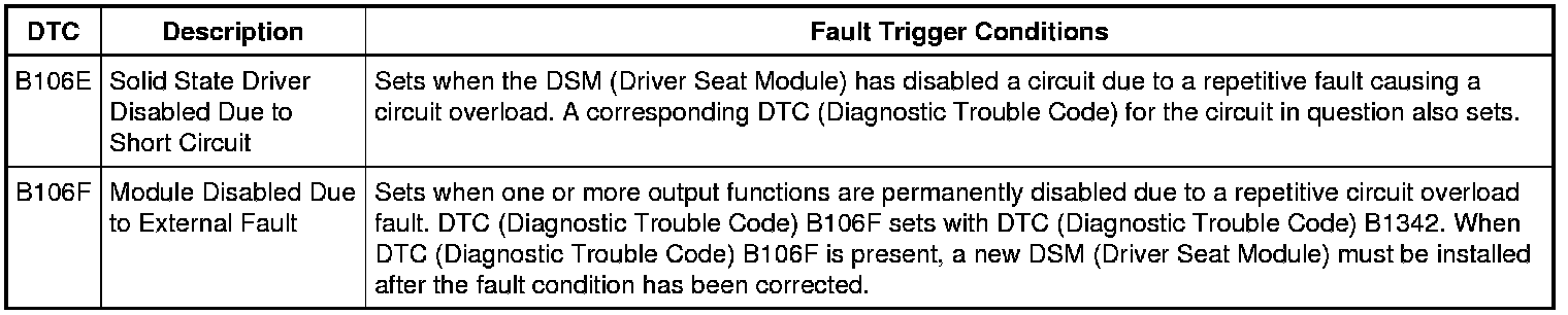 The DSM (Driver Seat Module) controls the output to the exterior mirrors using solid state drivers. A DTC (Diagnostic Trouble Code) sets when an overload occurs on any of these drivers. The DSM (Driver Seat Module) tracks the number of repetitive faults on each circuit. The DSM (Driver Seat Module) compares the number of overloads to 3 progressive thresholds established for each circuit. If the 3 thresholds have not been exceeded, then the DTC (Diagnostic Trouble Code) of the affected circuit can be cleared by eliminating the fault, then clearing the DTCs (Diagnostic Trouble Codes) and running the self-test. At the point that each of the first 2 thresholds are exceeded, DTC (Diagnostic Trouble Code) B106E sets along with the DTC (Diagnostic Trouble Code) relating to the affected circuit. Once the final threshold has been exceeded, the affected output is permanently disabled and DTC (Diagnostic Trouble Code) B106F sets along with DTC (Diagnostic Trouble Code) B1342, at which time the DSM (Driver Seat Module) must be replaced.