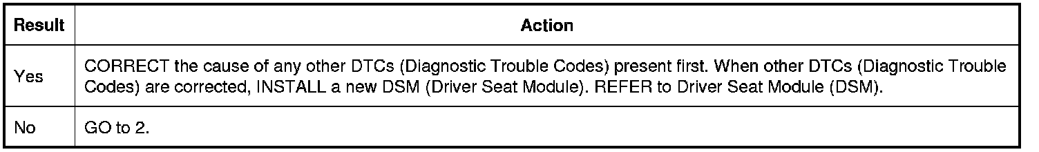 1. Repair the cause of any DTCs (Diagnostic Trouble Codes) present, other than DTC (Diagnostic Trouble Code) B106E. REFER to DTC Chart: Driver Seat Module (DSM) DTC Chart: Driver Seat Module (DSM).