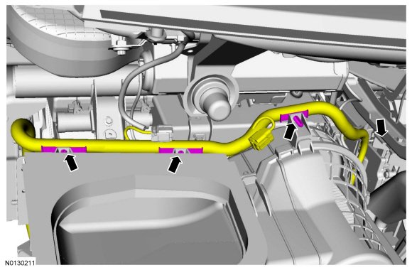 2. Attach the instrument panel wire harness to the heater core and evaporator, attach the wire harness pin-type retainers and connect the 3 electrical connectors.