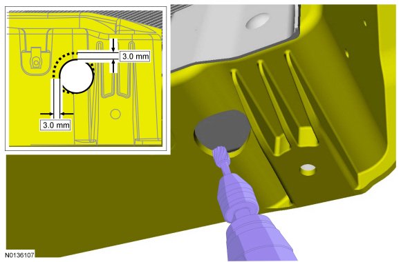 3. Remove 3.0 mm (0.118 in) of material from the inboard and front of the opening utilizing a rotary tool.