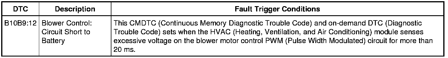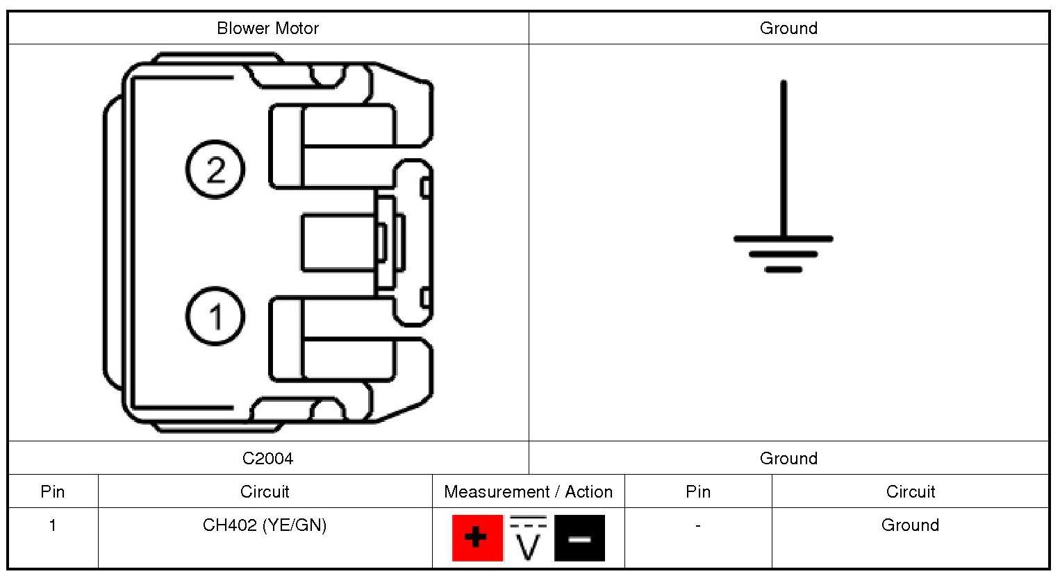 When the blower motor relay coil receives a ground from the HVAC (Heating, Ventilation, and Air Conditioning) module, the relay coil is energized and voltage is delivered to the blower motor and the blower motor speed control from the relay. Ground for the motor is provided from the blower motor speed control. Ground is provided for the blower control module. The HVAC (Heating, Ventilation, and Air Conditioning) module sends a PWM (Pulse Width Modulated) signal to the blower motor speed control to control the blower speed.