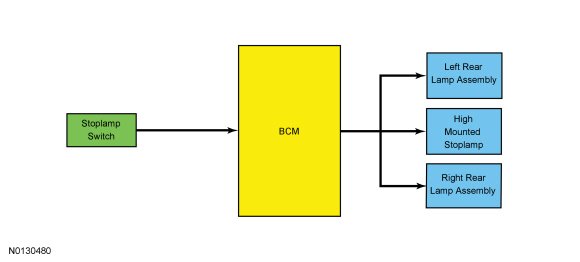 The BCM (Body Control Module) monitors the input from the stoplamp switch. When the brake pedal is applied, voltage is routed to the BCM (Body Control Module), the PCM (Powertrain Control Module) and (if equipped) the RFA (Remote Function Actuator) module. The BCM (Body Control Module) then supplies voltage to the stoplamps.