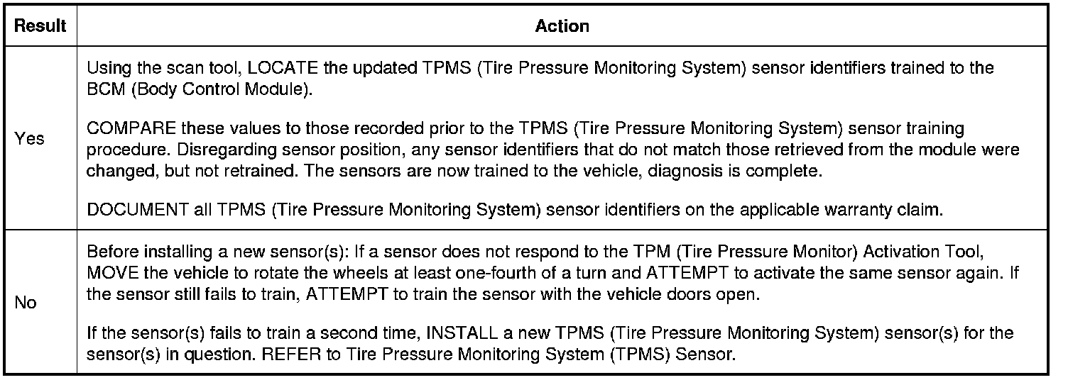 1. Train all 4 TPMS (Tire Pressure Monitoring System) sensors. REFER to Tire Pressure Monitoring System (TPMS) Sensor Training - Intelligent Access (IA) Tire Pressure Monitoring System (TPMS) Sensor Training - Intelligent Access (IA) or REFER to Tire Pressure Monitoring System (TPMS) Sensor Training - Integrated Keyhead Transmitter (IKT) Tire Pressure Monitoring System (TPMS) Sensor Training - Integrated Keyhead Transmitter (IKT).