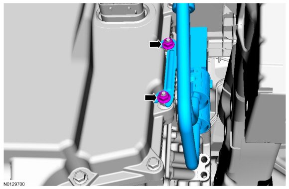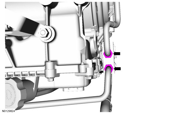 3. Loosen the 2 transmission mounted transmission fluid cooler tube nuts from the transmission fluid thermal bypass valve.