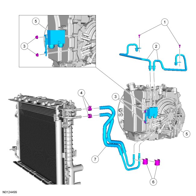 6. Position the 2 transmission mounted transmission fluid cooler tubes on the transmission and tighten the 2 transmission fluid cooler tube nuts.