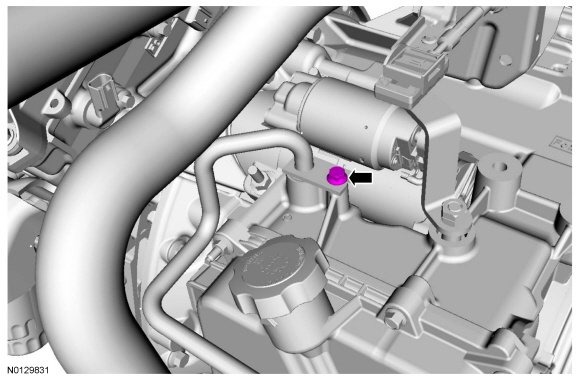 4. Remove and discard the transmission mounted transmission fluid cooler outlet tube bolt.