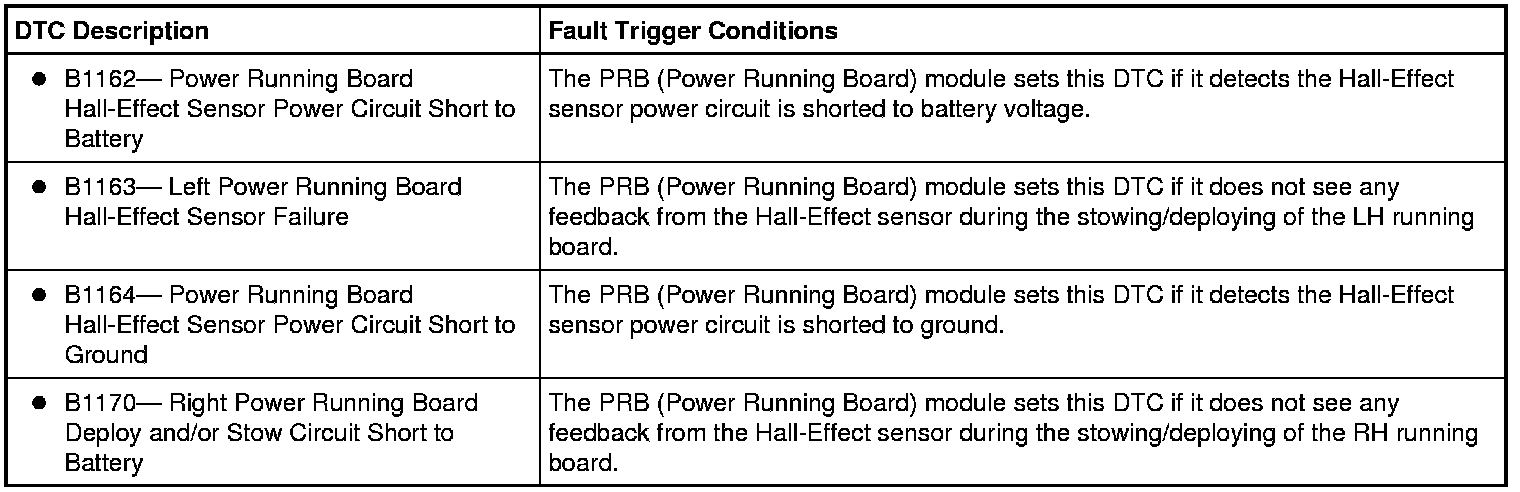 The Power Running Board (PRB) module provides a regulated 10-volt power supply to the Hall-effect sensor (internal to the PRB (Power Running Board) motor) through circuit CPR47 (GY/BN). The Hall-effect ground is provided by the PRB (Power Running Board) module through circuit RPR47 (BU/GN). The PRB (Power Running Board) module monitors the PRB (Power Running Board) Hall-effect signal through circuit VPR43 (GY/BU) (LH) or VPR46 (GY) (RH). If the PRB (Power Running Board) module does not receive any signal from the Hall-effect sensor during operation, the PRB (Power Running Board) will stop.