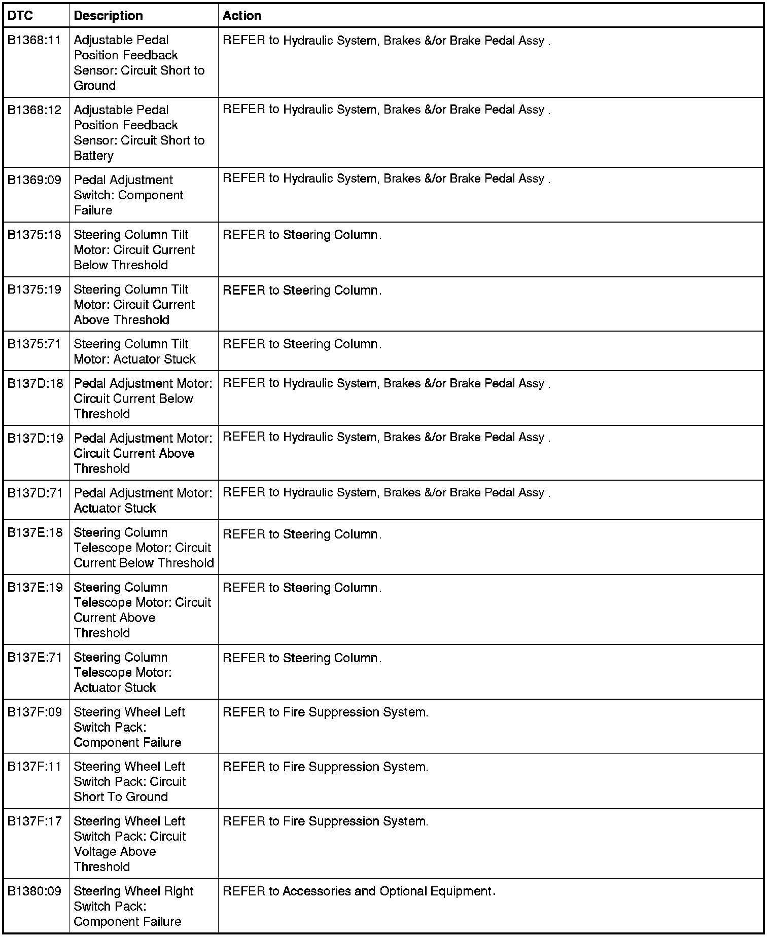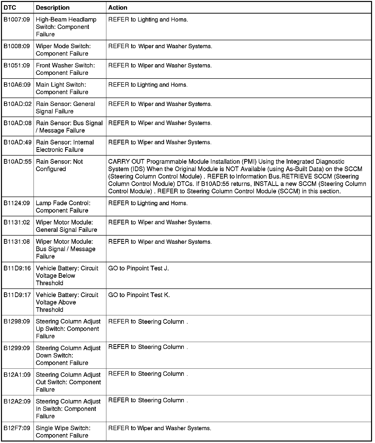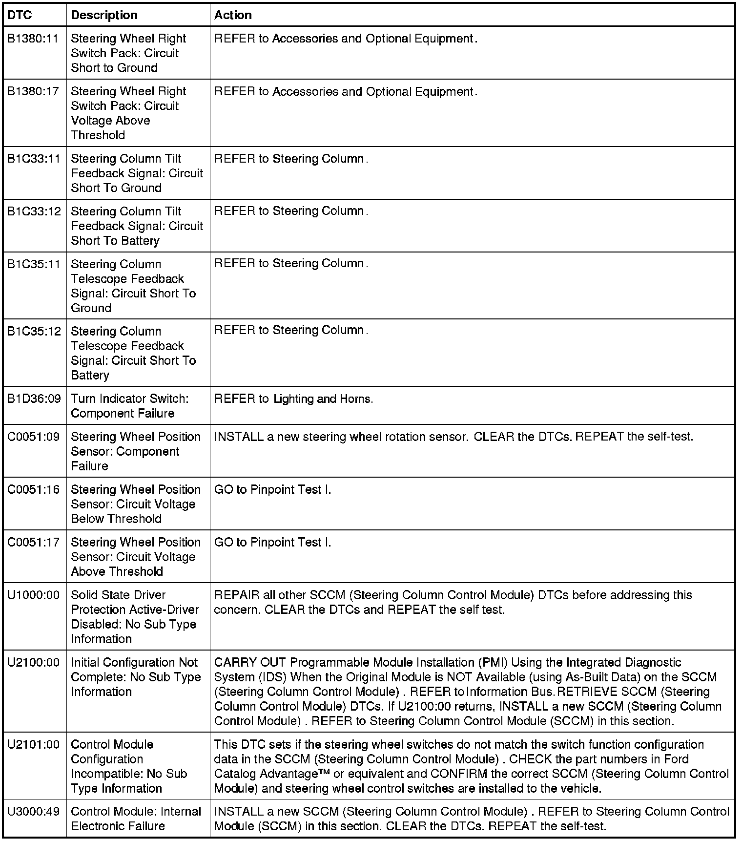 Steering Column Control Module (SCCM) DTC Chart