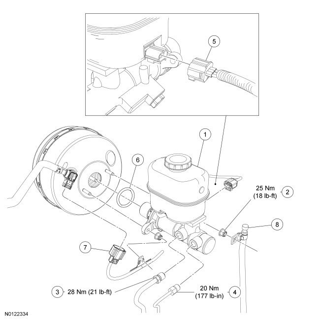 - To install, tighten primary brake tube fitting to 28 Nm (21 lb-ft).
