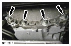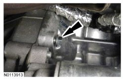 16. Tighten the 2 LH bellhousing-to-oil pan bolts to 48 Nm (35 lb-ft).
