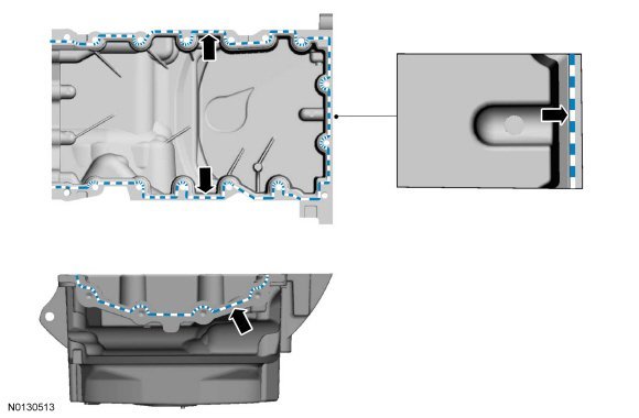Apply a 3 mm (0.11 in) bead of Motorcraft(R) High Performance Engine RTV Silicone on the inside edge of the oil pan to the sealing surface of the oil pan-to-engine block and to the oil pan-to-engine front cover mating surface.