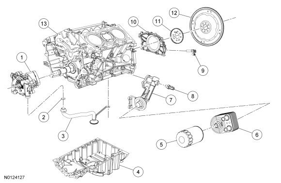 NOTE: Early build engine crankshaft main bearing cap bolt torque is different than late build engines. Although these parts are serviced in the same way, the torque has changed between early build and late build engines. The level of the engine can be determined by inspecting the engine code label. Early build engines are built with the engine code of (1G 372 BA) and late build engines are built with engine code (1G 372 CA).