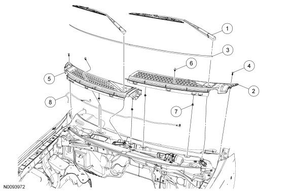 - Starting at the center of the vehicle, depress the forward tab and press upward on the front edge of the cowl grille panel to release it from the cowl.