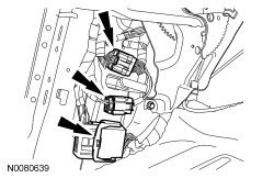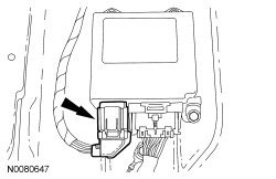 45. Lift the small carpet flap and disconnect the small Restraints Control Module (RCM) connector.