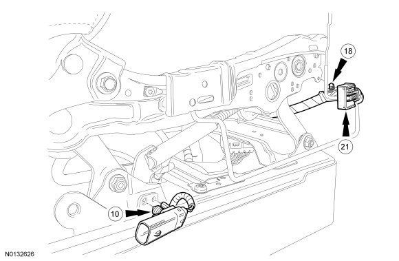1. Install the front passenger seat wire harness. For correct installation, refer to the following views. Retainers and electrical connectors are numbered in order of assembly. Match the numbers in the Retainer and Connector Location Views and attach accordingly.