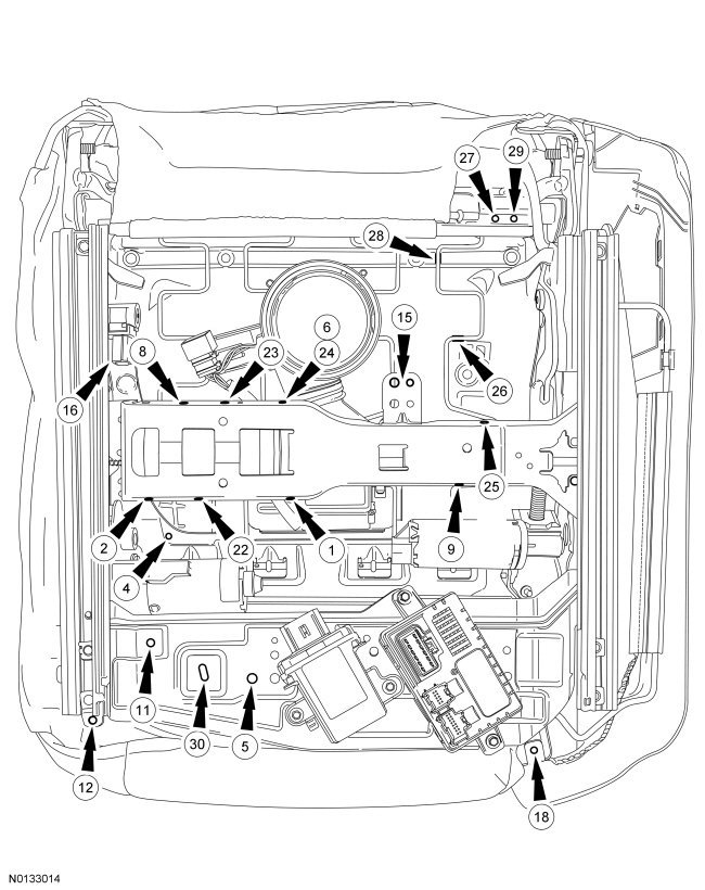 2. NOTE: Illustration shows Occupant Classification System (OCS) weight sensor bolts in their installed position with the seat in the vehicle (arrow indicates front).