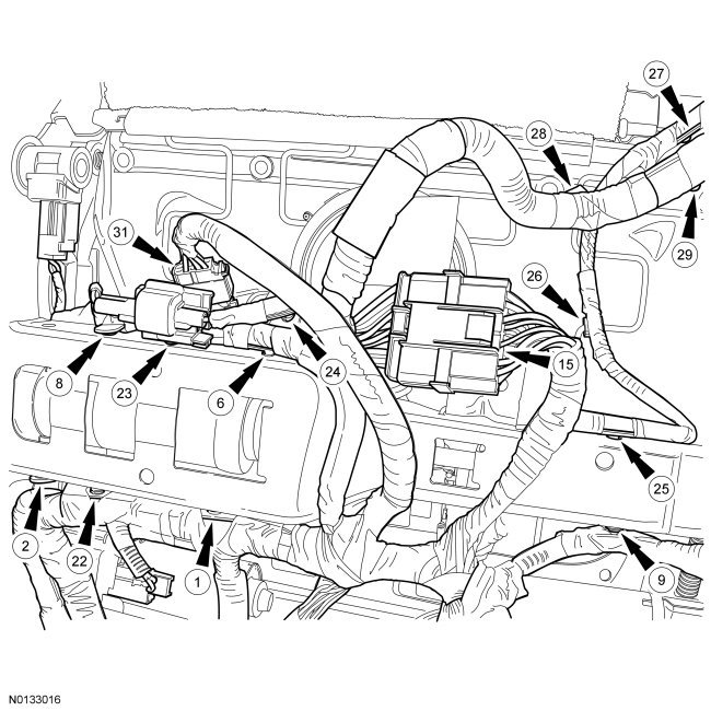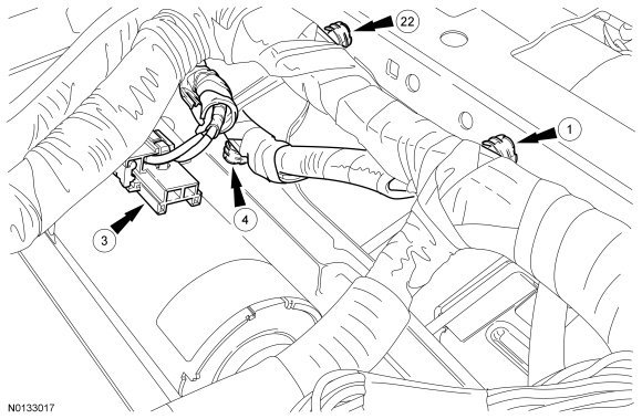 h Wire harness must correctly pass over other harnesses, as shown. Refer to Wire Harness Retainer and Connector Location View - Motor Bracket.