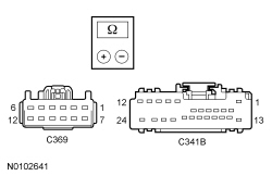 - Measure the resistance between seat control switch C369, harness side and DSM (Driver Seat Module) C341B, harness side using the following chart: