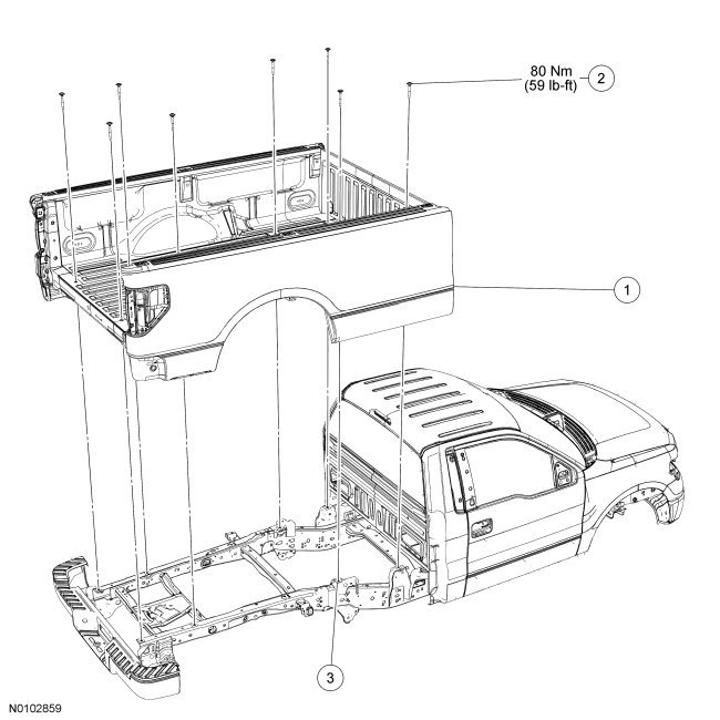 11. NOTE: The pickup bed bolts are one-time-use only. Install new bolts whenever the bolts are removed.