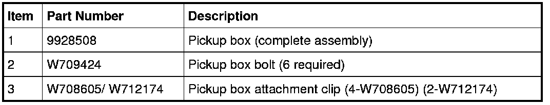 12. NOTE: New attachment clips must be installed whenever the pickup box is removed. All 8-foot pickup beds will have 8 attachment clips; all others will have 6 attachment clips.