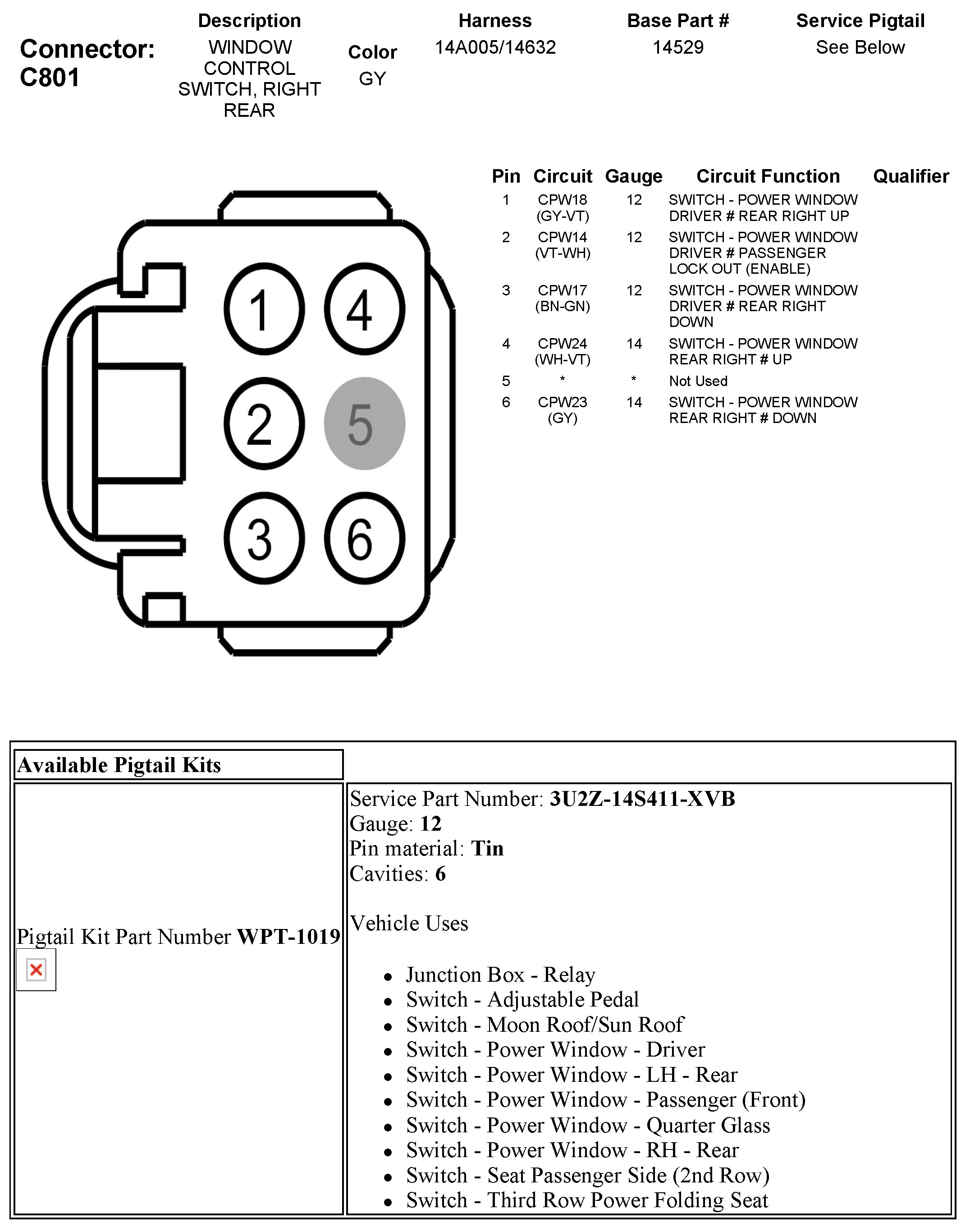 C801 Window Control Switch, Right Rear