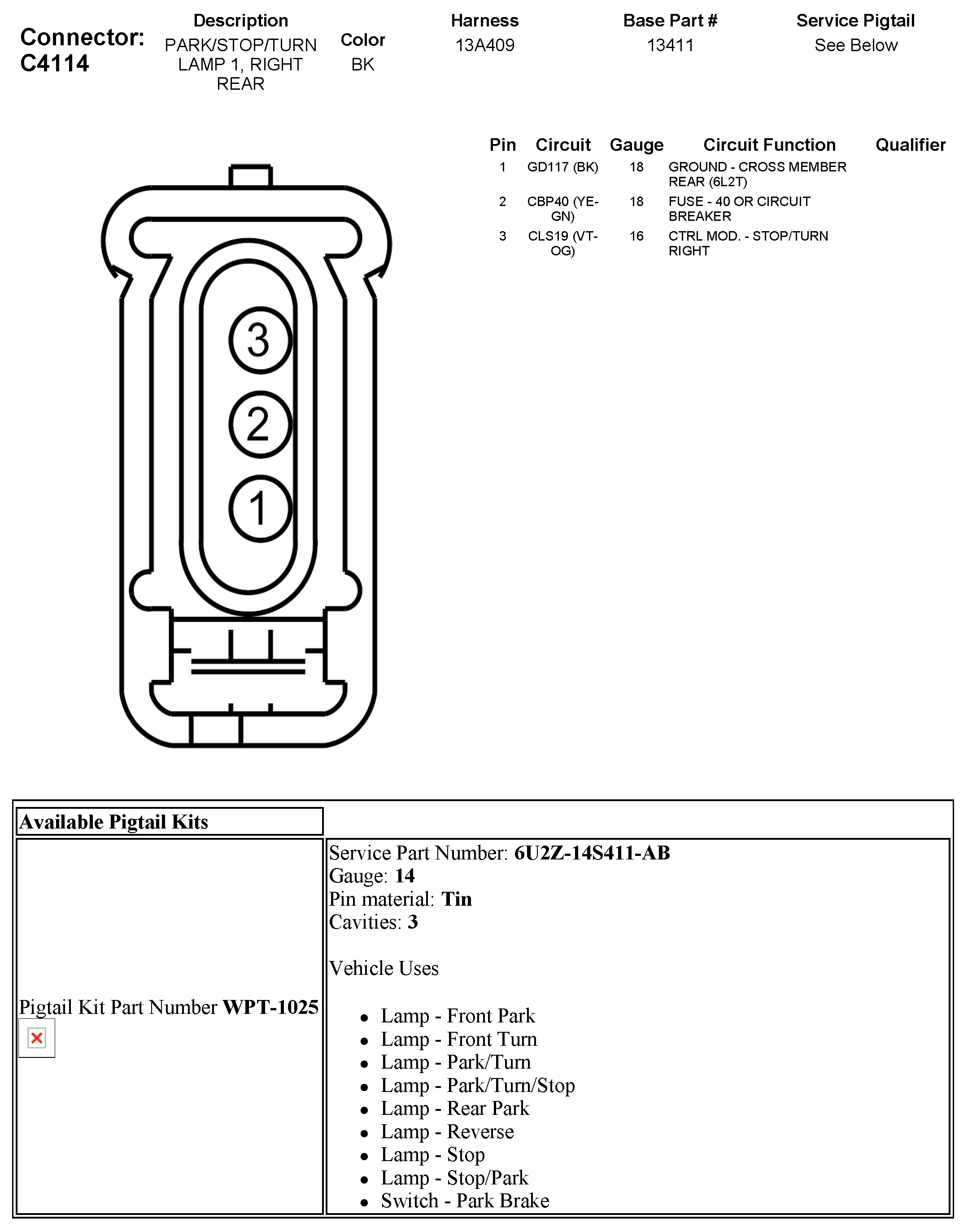 C4114 Park/Stop/Turn Lamp 1, Right Rear