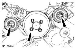 31. Remove the 6 bolts, coolant pump pulley and the 2 accessory drive belt idler pulleys.