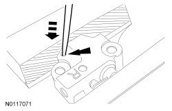 30. Install a small pick into the tensioner to hold the rack pawl and plunger in the seated position for tensioner installation.