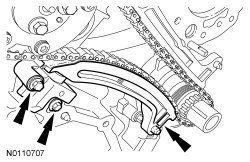 33. NOTE: Make sure the upper half of the timing chain is below the tensioner arm dowel and above the chain guide pin.