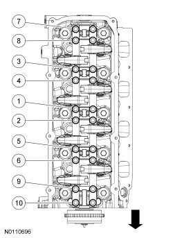 26. Tighten the 10 RH intake rocker arm shaft assembly bolts in the sequence shown, in 3 stages.