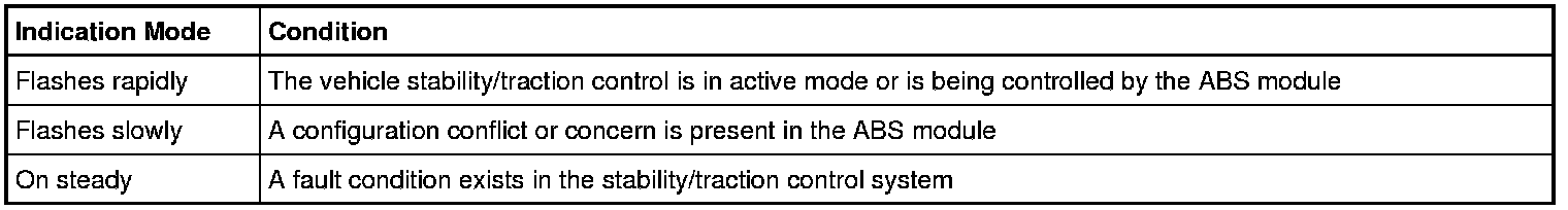 The Instrument Panel Cluster (IPC) receives the stability/traction control indicator request from the ABS module over the High Speed Controller Area Network (HS-CAN). The stability/traction control indicator operates according to the following chart: