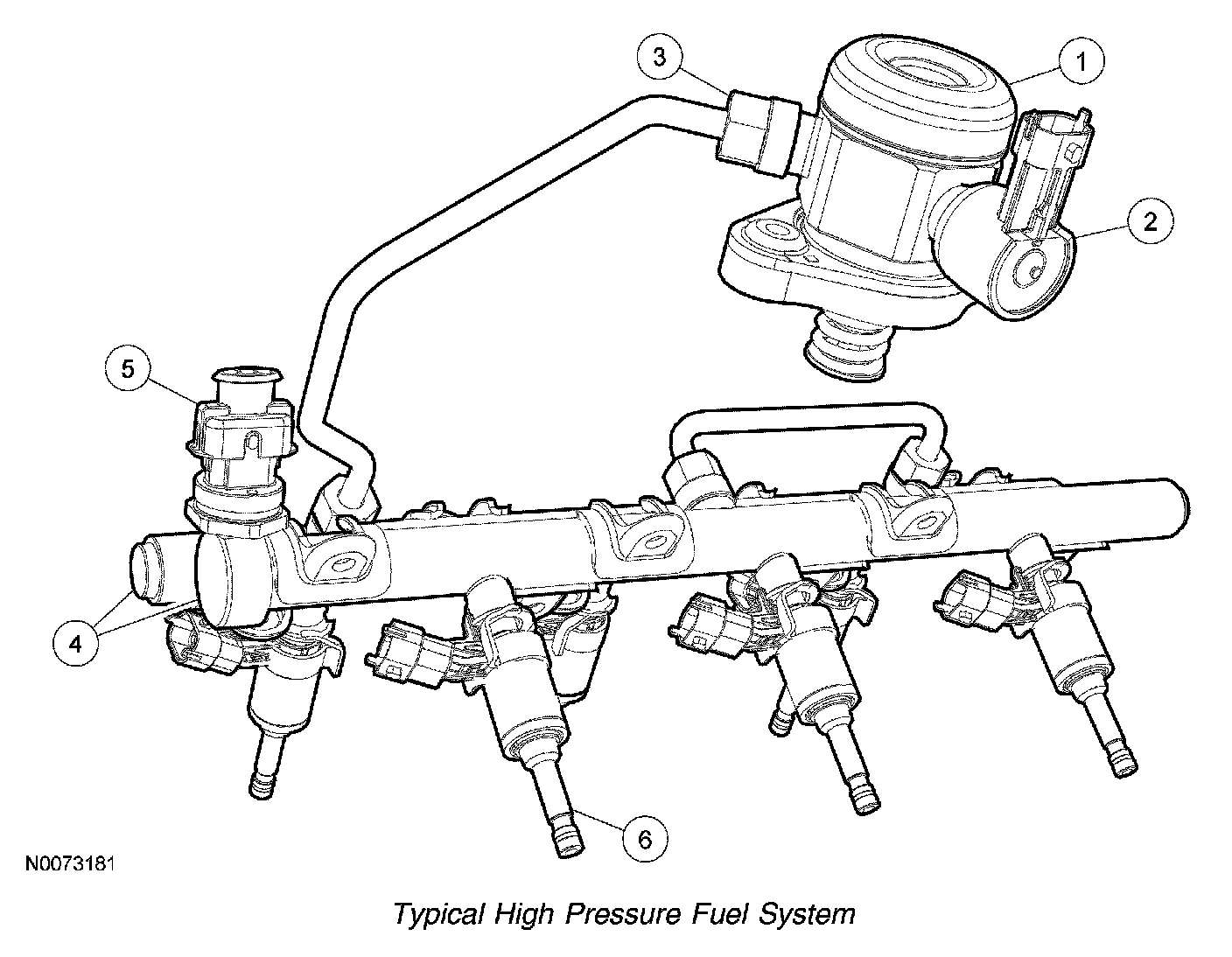 The high pressure fuel system receives low pressure fuel from the fuel pump assembly and delivers fuel at high pressure to the direct injection fuel injectors.