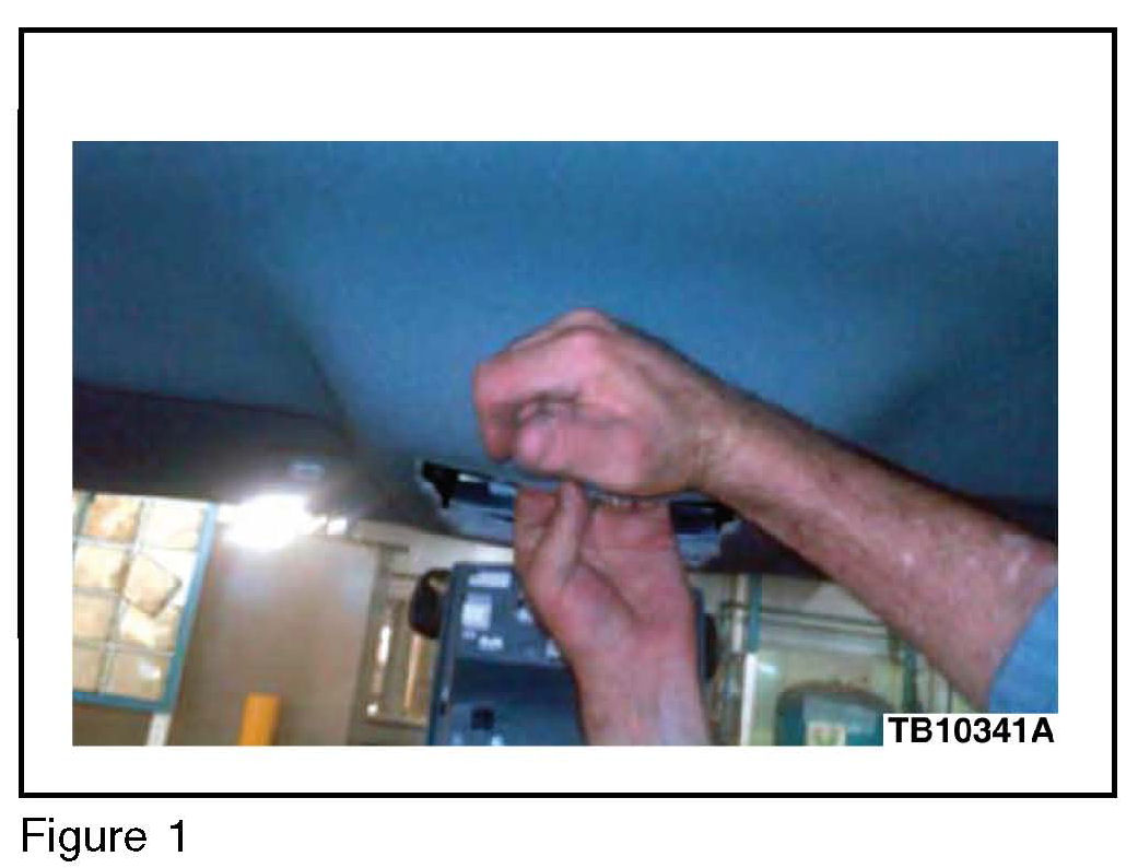 6. Using the palm of your hand, lightly tap the headliner at the overhead console to move it forward 3-4 mm (1/8-5/32"). (Figure 1)