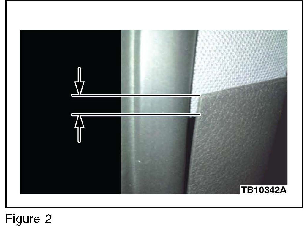 7. Loosely reposition the lefi hand and right hand A-pillar trim panels and measure the headliner leading edge protrusion into the space covered by the trim. There should be 6 mm (1/4") trim overlap over the headliner leading edge. (Figure 2)